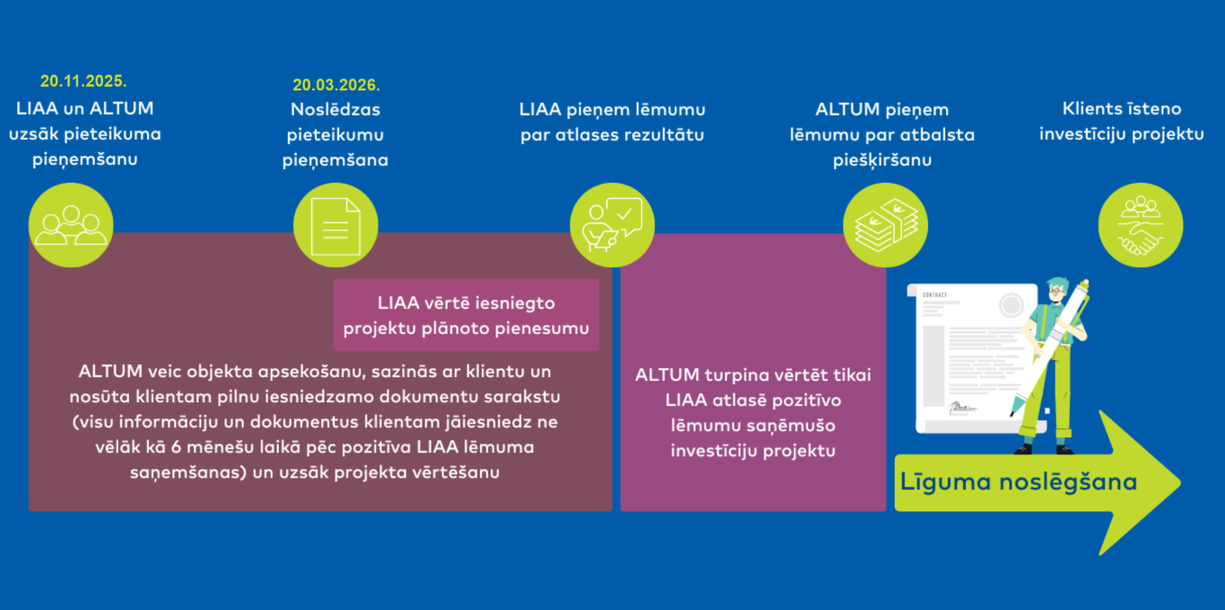 - Altum savu lēmumu pieņem pēc LIAA pozitīva lēmuma par atlases rezultātu, visas ar investīciju projekta vērtēšanu saistītās informācijas saņemšanas, un ja investīciju projektu līdzfinansējat ar citu finansētāju – pēc pozitīva cita finansētāja (piem., bankas) lēmuma saņemšanas