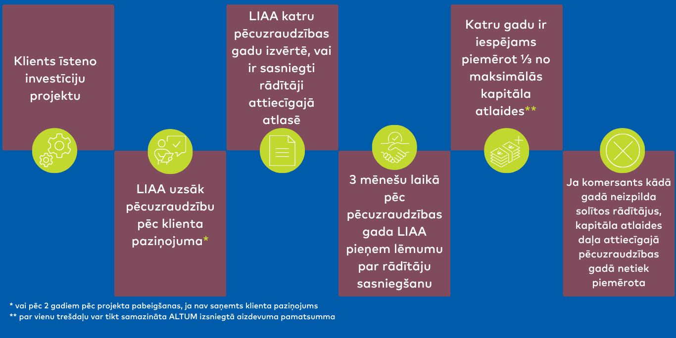 - Altum savu lēmumu pieņem pēc LIAA pozitīva lēmuma par atlases rezultātu, visas ar investīciju projekta vērtēšanu saistītās informācijas saņemšanas, un ja investīciju projektu līdzfinansējat ar citu finansētāju – pēc pozitīva cita finansētāja (piem., bankas) lēmuma saņemšanas