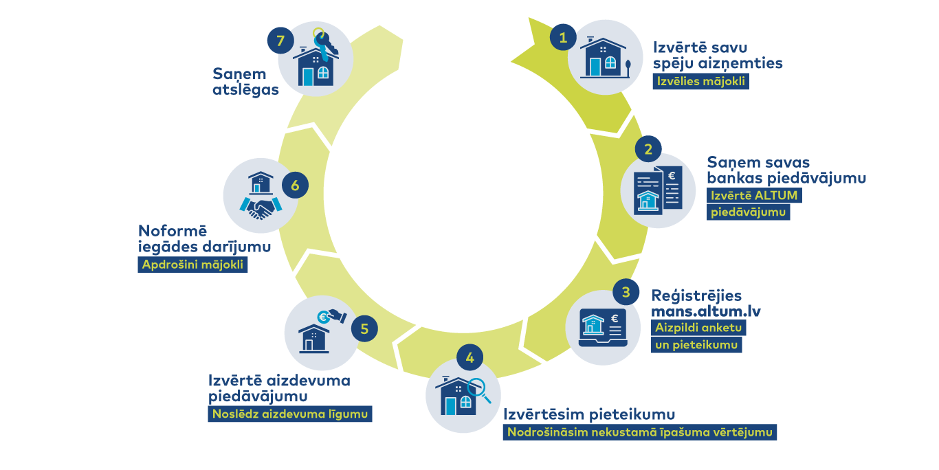 Aizpildi klienta anketu un pieteikumu, kā arī pievieno nepieciešamos dokumentus – konta pārskatu par 12 mēnešiem un nekustamā īpašuma vērtējumu, ja tāds jau sagatavots un nav vecāks par 6 mēnešiem. Aizpildot pieteikumu, var pieteikties arī ALTUM BALSTS subsīdijai.